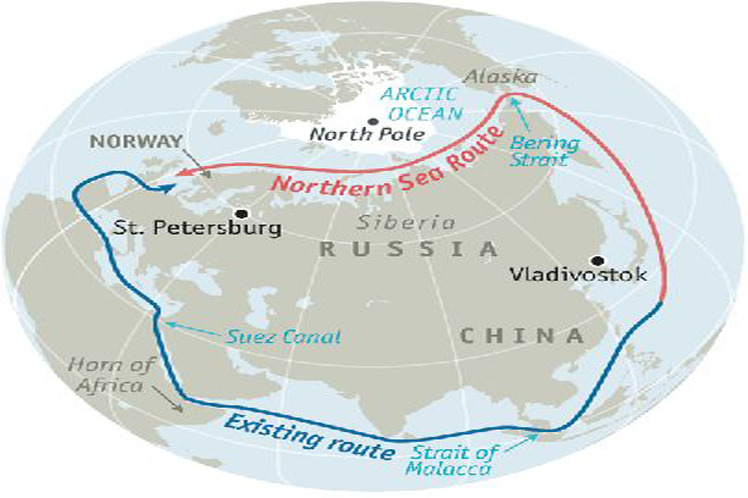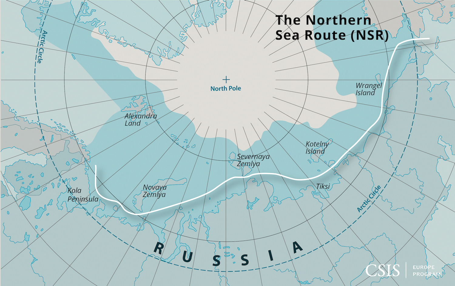 Εδώ και χρόνια, επομένως, ρωσική στρατηγική προτεραιότητα (https://www.csis.org/features/ice-curtain-russias-arctic-military-presence) είναι η επικράτηση στη ‘‘βόρεια θαλάσσια διαδρομή’’ (Northern Sea Route – NSR, ίδετε τον 1ο Χάρτη στο τέλος του κειμένου) η οποία διασχίζοντας τα 5.600 χλμ από τον Βερίγγειο Πορθμό μέχρι τα Στενά της θάλασσας του Καρά αποτελεί την ‘‘ολοκλήρωση’’ της ‘‘περιφερειακής περικύκλωσης’’ της Heartland. Γι’ αυτό, οι Ρώσοι παραχώρησαν πλήρη δικαιοδοσία στην ‘‘Rosatom’’, τον κρατικό φορέα ατομικής ενέργειας, ώστε να έχει τον γραφειοκρατικό έλεγχο του NSR, δίνοντας αυτός μόνο άδεια σε πλοία που θέλουν να διασχίσουν τη διαδρομή αφού αιτηθούν τη διέλευση 45 μέρες πριν!