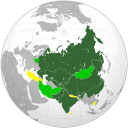 5ος Χάρτης: Στην υδρόγειο σφαίρα με βαθύ πράσινο χρώμα εμφανίζεται η γεωγραφικά επικράτεια των κρατών-μελών του Οργανισμού Συνεργασίας της Σαγκάης, με ανοιχτό πράσινο χρώμα οι χώρες παρατηρητές του Οργανισμού (φίλιες χώρες) και με κίτρινο χρώμα οι βρισκόμενες σε διάλογο με τον Οργανισμό χώρες (dialogue partners, χώρες που είναι υποψήφιες για να συμμετάσχουν στον Οργανισμό).