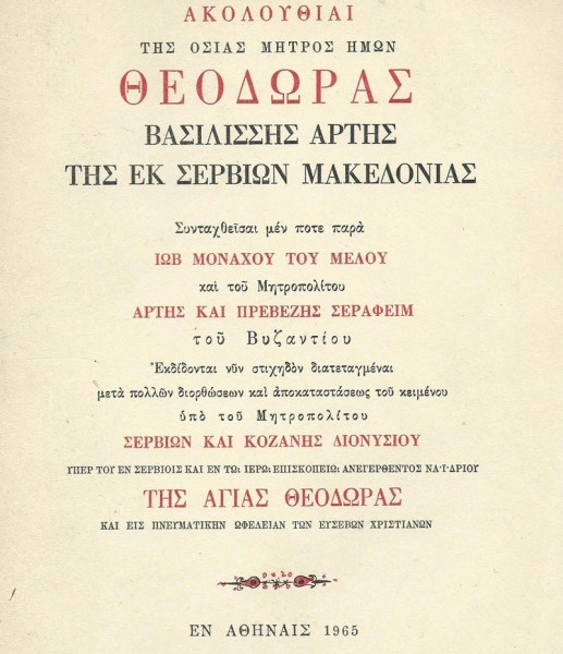 Επιτελέσαμε (4-7-2021, Κυριακή Β’ Ματθαίου) σύναξη ‘’εν Σερβίοις (Κοζάνης)’’ (Δίπτυχα της Εκκλησίας της Ελλάδος 2021) της ‘’Οσίας μητρός ημών Θεοδώρας Βασιλίσσης Άρτης της εκ Σερβίων Μακεδονίας’’ (Ακολουθίαι της Οσίας υπό του [μακαριστού] Μητροπολίτου Σερβίων και Κοζάνης Διονυσίου. Εν Αθήναις 1965).