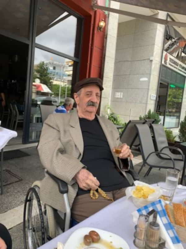 Περιστοιχισμένος από συγγενείς και φίλους μεσημεράκι στο καλομεζέδικο ουζερί ΜΠΙΖ-ΜΠΙΖΕ στη γειτονιά του στο «πέτρινο» σχολείο, σε μια τσιπουροπαρέα (όχι ο δάσκαλος πίνει το αγαπημένο του ουίσκι), αναπολεί και αφηγείται με περηφάνεια τα περπατήματά του, με έναν καθαρό και λιτό λόγο.