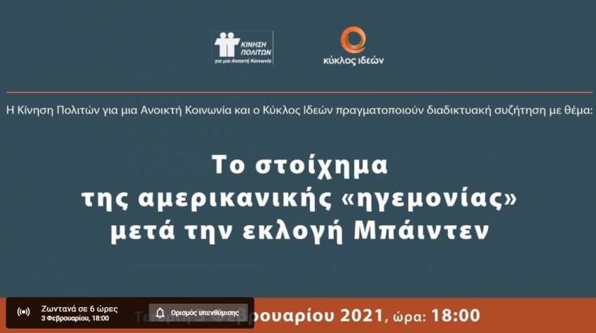 Η Κίνηση Πολιτών για μια Ανοιχτή Κοινωνία και ο Κύκλος Ιδεών πραγματοποιούν διαδικτυακή συζήτηση με θέμα: Το στοίχημα της αμερικανικής «ηγεμονίας» μετά την εκλογή Μπάιντεν Σήμερα Τετάρτη 3 Φεβρουαρίου 2021, ώρα 18:00