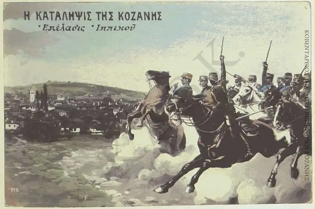 Δεν μιλάει. Κυττάζει μόνον τα αντικρυνά βουνά του Αηλιά για να ανακαλύψη εχθρό: Το άλογο του και αυτός είνε τυλιγμένοι μέσα σε μια τεράστια μεταξωτή γαλάζια σημαία. Ποιος τον τύλιξε; Που βρέθηκεν η ελληνική σημαία στην Κοζάνη; ένας γέρος Κοζανίτης με άσπρα μακρυά μαλλιά γονατίζει και με κλάμματα φιλάει τα ρουθούνια του αλόγου του. Τα κορίτσια του βάζουν βασιλικό και χρυσάνθημα στα χαλινάρια, στα λουριά, στη θήκη του σπαθιού του.