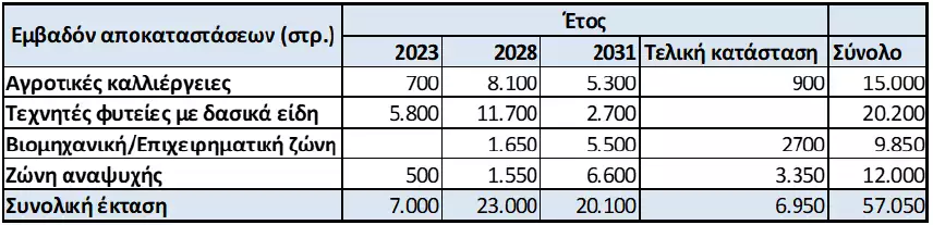 1. Το εμβαδόν των αποκατεστημένων εκτάσεων προσδιορίζεται μεν σε διάφορες χρονικές φάσεις (2023, 2028, 2031), όπως φαίνεται παραπάνω, αλλά δεν υπάρχει χρονική δέσμευση για την διαμόρφωση της «τελικής κατάστασης».