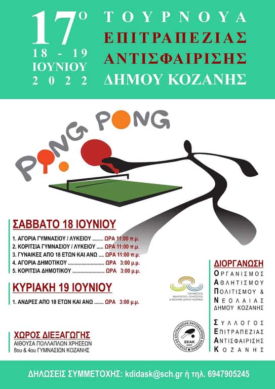 Να επισημάνουμε πως το 1ο τουρνουά διεξήχθη το 2004 και από τότε καθιερώθηκε στη συνείδηση όλων των φίλων του αθλήματος. Αναπτύχθηκε και συγκεντρώνει το ενδιαφέρον των αθλητών και των φίλων του πινγκ – πονγκ από όλη τη Δυτική Μακεδονία και όχι μόνο. Το 17ο τουρνουά θα διεξαχθεί το διήμερο 18-19 Ιουνίου στην αίθουσα εκδηλώσεων των 4ου και 8ου Γυμνασίων Κοζάνης. Για μια ακόμη χρονιά αποφασίστηκε οι συμμετέχοντες, αντί παραβόλου συμμετοχής αλλά και όποιος άλλος θέλει, να φέρνουν κατά τη διάρκεια διεξαγωγής του τουρνουά, τρόφιμα που διατηρούνται εκτός ψυγείου, για να διατεθούν στο συσσίτιο απόρων του Δήμου Κοζάνης.