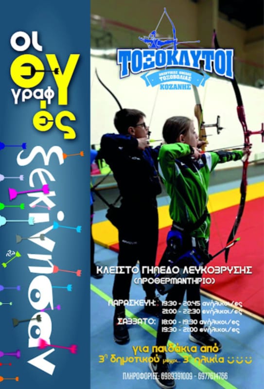 Οι εγγραφές ξεκίνησαν για τη νέα χρονιά στο κλειστό γήπεδο Λευκόβρυσης (προθερμαντήριο) . Φέτος έχουμε τη χαρά να συνεργαζόμαστε με τον κ. Αλέξανδρο Νασιούλα, ομοσπονδιακό προπονητή τοξοβολίας με πολλές διακρίσεις στο χώρο.