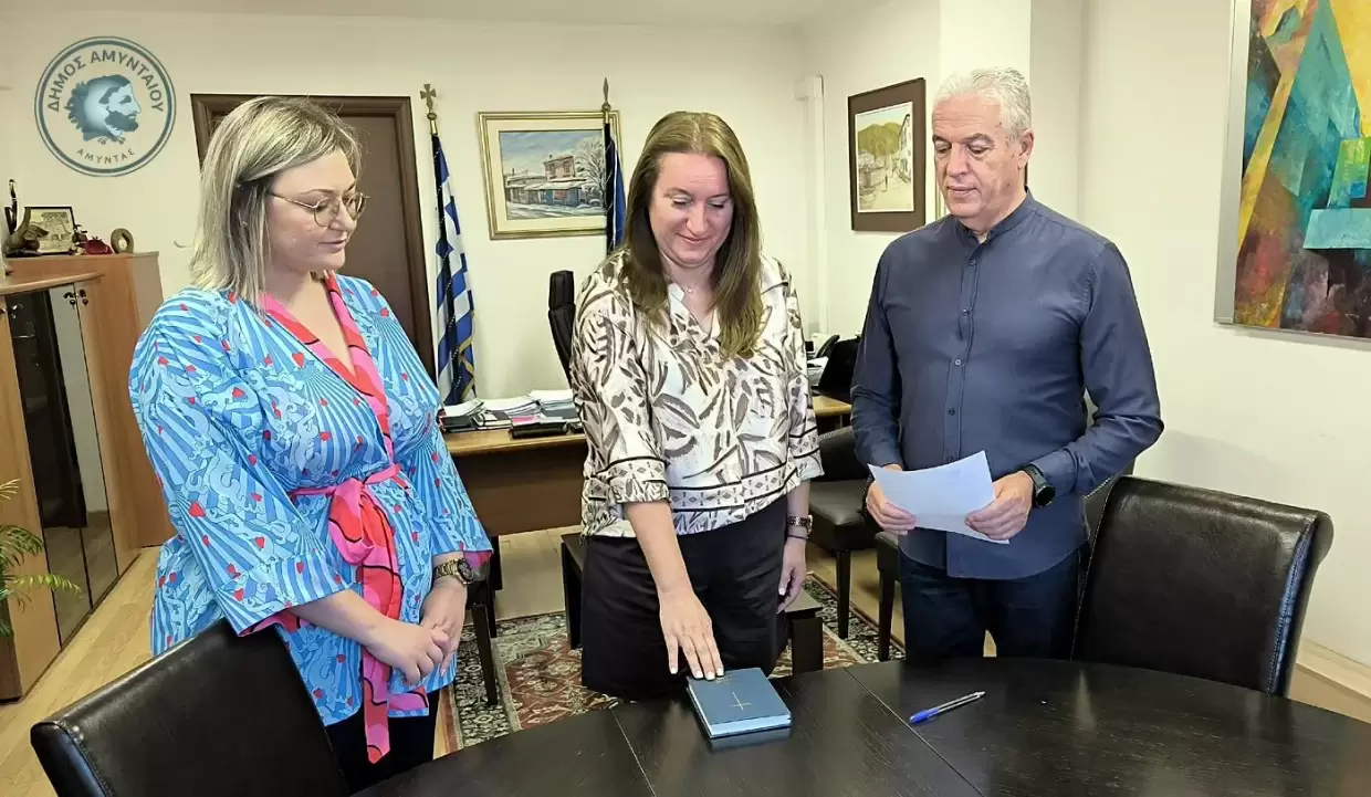 Τη νέα υπάλληλο υποδέχθηκαν με θερμές ευχές για καλή αρχή και επιτυχή θητεία ο Δήμαρχος Αμυνταίου Ιωάννης Λιάσης και η Αντιδήμαρχος Διοικητικών Θεμάτων, Κοινωνικής Πολιτικής και Προσχολικής Αγωγής Ευδοξία Ζαφειρίδου.