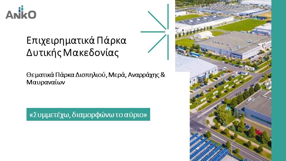 Το σχεδιασμό για την ανάπτυξη τεσσάρων Θεματικών Επιχειρηματικών Πάρκων, που προωθούνται κατά προτεραιότητα στην Περιφέρεια Δυτικής Μακεδονίας, με στόχο την ενίσχυση της επιχειρηματικότητας μέσω της δημιουργίας σύγχρονων υποδομών και την αλλαγή του επιχειρηματικού μοντέλου, προς την κυκλική οικονομία και την βιομηχανική συμβίωση, παρουσίασε σήμερα, 28 Νοεμβρίου, η ΑΝΚΟ Δυτικής Μακεδονίας Α.Ε., στους Δήμους Αμύνταιου και Εορδαίας.