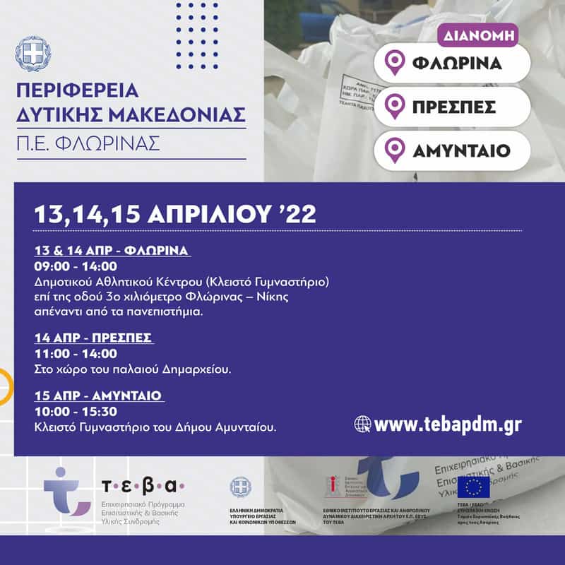 Οι εν λόγω εταίροι θα διανείμουν : ο Δήμος Φλώρινας μέσω της κοινωφελούς επιχείρησης και η Ιερά Mητρόπολη Φλώρινας στις 13 & 14 Απριλίου 2022 ημέρες Τετάρτη και Πέμπτη, και τις ώρες 9:00πμ -2:00μμ στο χώρο του Δημοτικού Αθλητικού Κέντρου (Κλειστό Γυμναστήριο) επί της οδού 3ο χιλιόμετρο Φλώρινας – Νίκης απέναντι από τα πανεπιστήμια, ο Δήμος Αμυνταίου στις 15 Απριλίου 2022 ημέρα Παρασκευή τις ώρες 10:00πμ -3:30μμ στο χώρο του Κλειστού Γυμναστηρίου του Δήμου Αμυνταίου, ενώ ο Δήμος Πρεσπών στις 14 Απριλίου 2022 ημέρα Πέμπτη τις ώρες 11:00πμ. -2:00 μμ. στο χώρο του παλαιού Δημαρχείου στους ωφελούμενους του προγράμματος.
