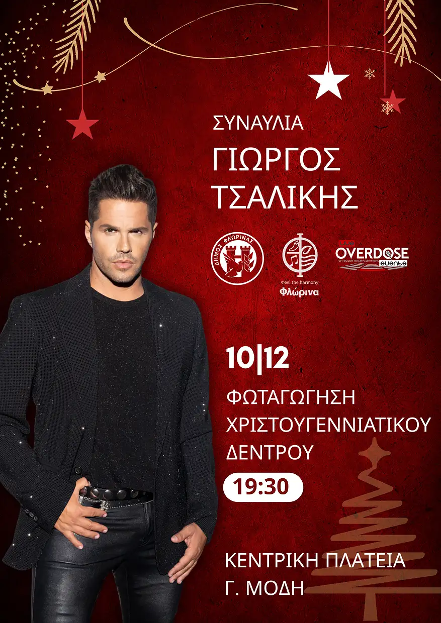 Στις 19:30 θα γίνει η φωταγώγηση του Δέντρου από τον Δήμαρχο Φλώρινας κ. Βασίλη Γιαννάκη και θα ακολουθήσει συναυλία με τον Γιώργο Τσαλίκη.
