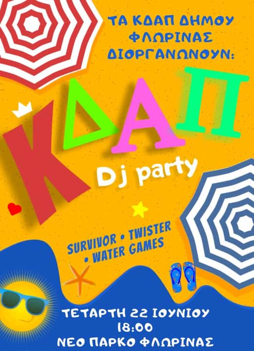 Τα ΚΔΑΠ του Δήμου Φλώρινας σας προσκαλούν στο πιο ξέφρενο καλοκαιρινό party, που θα πραγματοποιηθεί την Τετάρτη 22 Ιουνίου 2022 στις 6 το απόγευμα στο Νέο Πάρκο Φλώρινας.