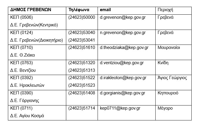 • Διευθύντρια ΚΕΠ Δήμου Γρεβενών κ.Ευδοξία Μπαζάκα, τηλ.(24623)53304 και έδρα στο ΚΕΠ 0124 (Διοικητήριο).