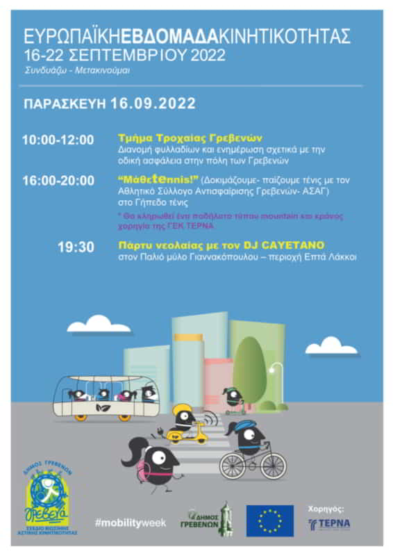 Με ενημέρωση, αθλητισμό και ψυχαγωγία, ξεκινά την Παρασκευή 16 Σεπτεμβρίου η Ευρωπαϊκή Εβδομάδα Κινητικότητας 2022 του Δήμου Γρεβενών, έχοντας ένα πλούσιο πρόγραμμα εκδηλώσεων, δράσεων και παρεμβάσεων, το οποίο θα διαρκέσει μέχρι και την Πέμπτη 22 Σεπτεμβρίου.