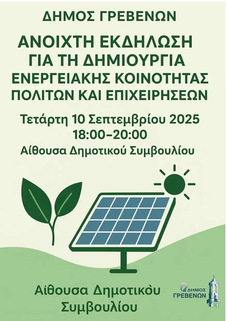 Η εκδήλωση αφορά επιχειρήσεις, πολίτες, φορείς και το πώς μπορούν να συνεργαστούν με τον Δήμο Γρεβενών για τη συλλογική παραγωγή και εξοικονόμηση ενέργειας.