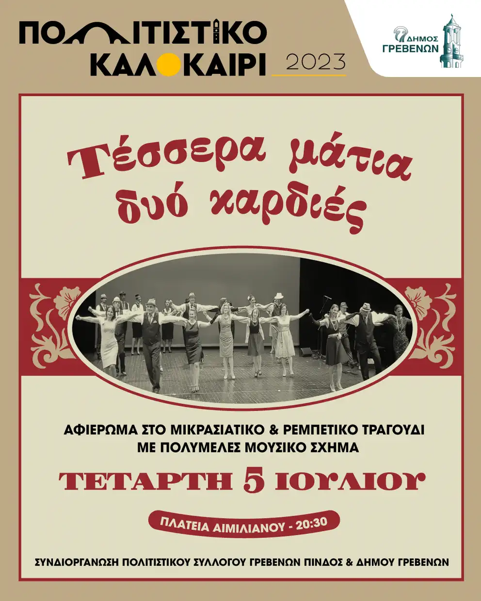 Ο Δήμος Γρεβενών μαζί με τον Πολιτιστικό Σύλλογο Γρεβενών «ΠΙΝΔΟΣ» διοργανώνουν μία σπουδαία μουσική παράσταση με τίτλο «Τέσσερα μάτια, δυό καρδιές», η οποία θα πραγματοποιηθεί στις 20:30 το βράδυ της Τετάρτης 5 Ιουλίου 2023 στην κεντρική Πλατεία Αιμιλιανού των Γρεβενών με ελεύθερη είσοδο.