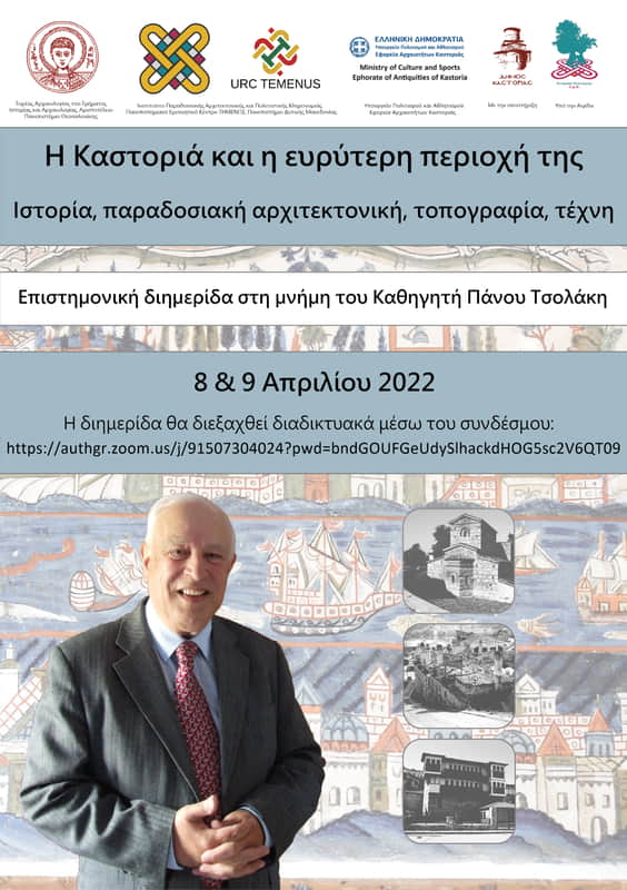 Το Ινστιτούτο Παραδοσιακής Αρχιτεκτονικής και Πολιτιστικής Κληρονομιάς του ΠΕΚ «ΤΗΜΕΝΟΣ» του Πανεπιστημίου Δυτικής Μακεδονίας, ο Τομέας Αρχαιολογίας του Τμήματος Ιστορίας και Αρχαιολογίας του Αριστοτελείου Πανεπιστημίου Θεσσαλονίκης και η Εφορεία Αρχαιοτήτων Καστοριάς συνδιοργανώνουν επιστημονική διημερίδα με θέμα «Η Καστοριά και η ευρύτερη περιοχή της: Ιστορία, παραδοσιακή αρχιτεκτονική, τοπογραφία, τέχνη», αφιερωμένη στη μνήμη του Καθηγητή του Τμήματος Αρχιτεκτόνων Μηχανικών της Πολυτεχνικής Σχολής του Αριστοτελείου Πανεπιστημίου Θεσσαλονίκης Πάνου Τσολάκη.