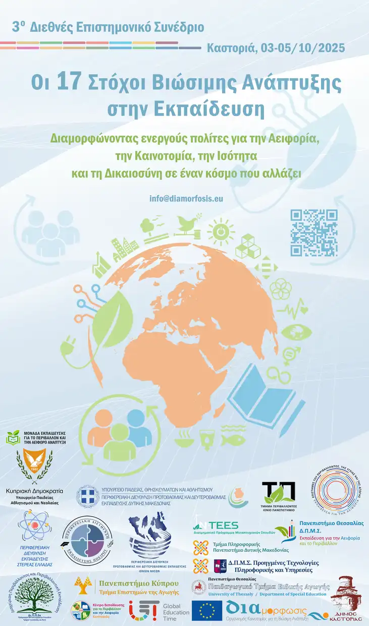 Ο Οργανισμός Καινοτομίας για τη Βιώσιμη Ανάπτυξη «Διαμόρφωσις» σε συνεργασία με το Διατμηματικό Πρόγραμμα Μεταπτυχιακών Σπουδών (Δ.Π.Μ.Σ.) «Επιστήμες του Περιβάλλοντος, της Υγείας και της Αγωγής: Εκπαίδευση για την Αειφορία» του Πανεπιστημίου Ιωαννίνων, το Μεταπτυχιακό Πρόγραμμα «Μάθηση στις Φυσικές Επιστήμες και το Περιβάλλον – Κατεύθυνση Περιβαλλοντική Εκπαίδευση και Εκπαίδευση για την Αειφορία» του Τμήματος Επιστημών της Αγωγής του Πανεπιστημίου Κύπρου, το Πρόγραμμα Μεταπτυχιακών Σπουδών (Π.Μ.Σ.) «Διαχείριση Περιβάλλοντος και Περιβαλλοντική Εκπαίδευση» του Διεθνούς Πανεπιστημίου της Ελλάδος, το Διιδρυματικό Πρόγραμμα Μεταπτυχιακών Σπουδών (Δ.Π.Μ.Σ.) «Προηγμένες Τεχνολογίες Πληροφορικής και Υπηρεσίες» του Πανεπιστημίου Δυτικής Μακεδονίας, το Διατμηματικό Πρόγραμμα Μεταπτυχιακών Σπουδών (Δ.Π.Μ.Σ.) «Νέες Τεχνολογίες για την Περιβαλλοντική Εκπαίδευση και τη Βιώσιμη Ανάπτυξη» του Ιονίου Πανεπιστημίου, Διατμηματικό Πρόγραμμα Μεταπτυχιακών Σπουδών (Δ.Π.Μ.Σ.) «Εκπαίδευση για την Αειφορία και το Περιβάλλον» του Πανεπιστημίου Θεσσαλίας, το Τμήμα Περιβάλλοντος του Ιονίου Πανεπιστημίου, Το Τμήμα Πληροφορικής του Πανεπιστημίου Δυτικής Μακεδονίας, την Περιφερειακή Διεύθυνση Πρωτοβάθμιας και Δευτεροβάθμιας Εκπαίδευσης Δυτικής Μακεδονίας, την Περιφερειακή Διεύθυνση Πρωτοβάθμιας και Δευτεροβάθμιας Εκπαίδευσης Στερεάς Ελλάδας, την Περιφερειακή Διεύθυνση Πρωτοβάθμιας και Δευτεροβάθμιας Εκπαίδευσης Ηπείρου, την Περιφερειακή Διεύθυνση Πρωτοβάθμιας και Δευτεροβάθμιας Εκπαίδευσης Ιονίων Νήσων, το Κέντρο Εκπαίδευσης για το Περιβάλλον και την Αειφορία (Κ.Ε.ΠΕ.Α./Κ.Π.Ε.) Καστοριάς τον Δήμο Καστοριάς και το Επιμελητήριο Καστοριάς διοργανώνουν το 3ο Διεθνές Επιστημονικό Συνέδριο «Οι 17 Στόχοι Βιώσιμης Ανάπτυξης στην Εκπαίδευση» – Διαμορφώνοντας ενεργούς πολίτες για την Αειφορία, την Καινοτομία, την Ισότητα και τη Δικαιοσύνη σε έναν κόσμο που αλλάζει στην Καστοριά από 3 έως 5 Οκτωβρίου 2025.