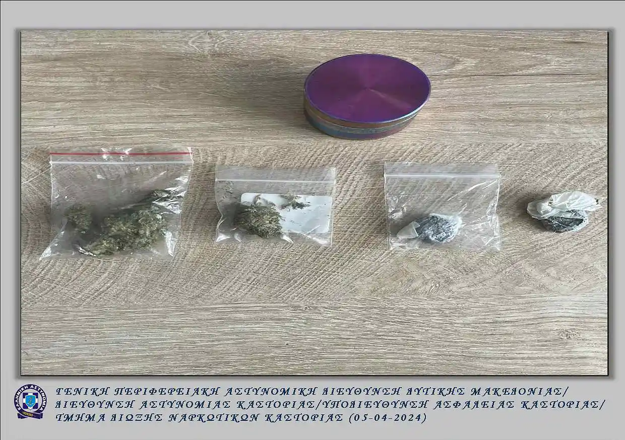 • στην πρώτη περίπτωση, συνελήφθη την 31-03-2024 το μεσημέρι στην Καστοριά, από αστυνομικούς του Τμήματος Δίωξης Ναρκωτικών της Υποδιεύθυνσης Ασφάλειας Καστοριάς, 20χρονη, διότι στην κατοχή της βρέθηκαν και κατασχέθηκαν μικροποσότητες ακατέργαστης κάνναβης και κατεργασμένης κάνναβης (σοκολάτα) καθώς και -1- τρίφτης με υπολείμματα κάνναβης,