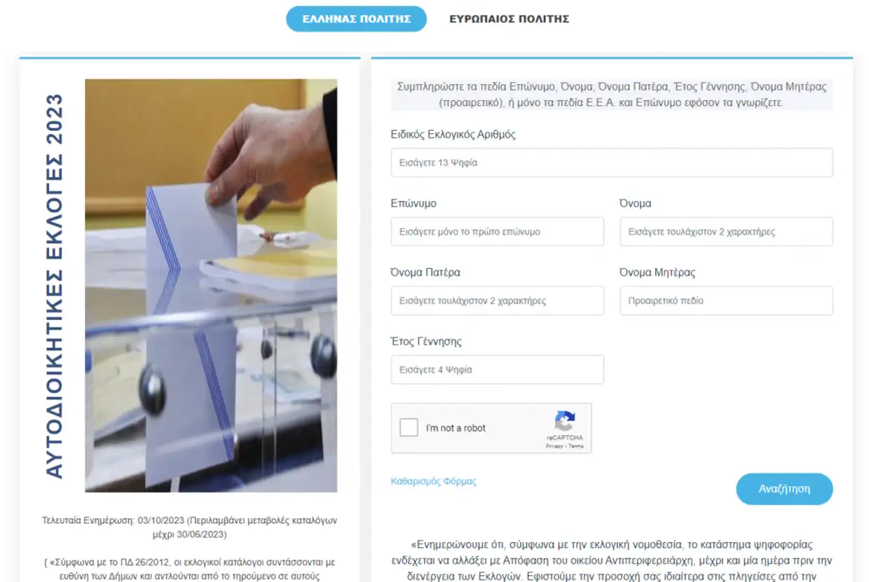 Σε λειτουργία τέθηκε την Τετάρτη (27/9) η ιστοσελίδα του υπουργείου Εσωτερικών «Μάθε που ψηφίζεις 2023», στην οποία μπορούν να πληροφορηθούν οι πολίτες το εκλογικό κέντρο στο οποίο υπάγονται ενόψει των αυτοδιοικητικών εκλογών της Κυριακής 8 Οκτωβρίου.