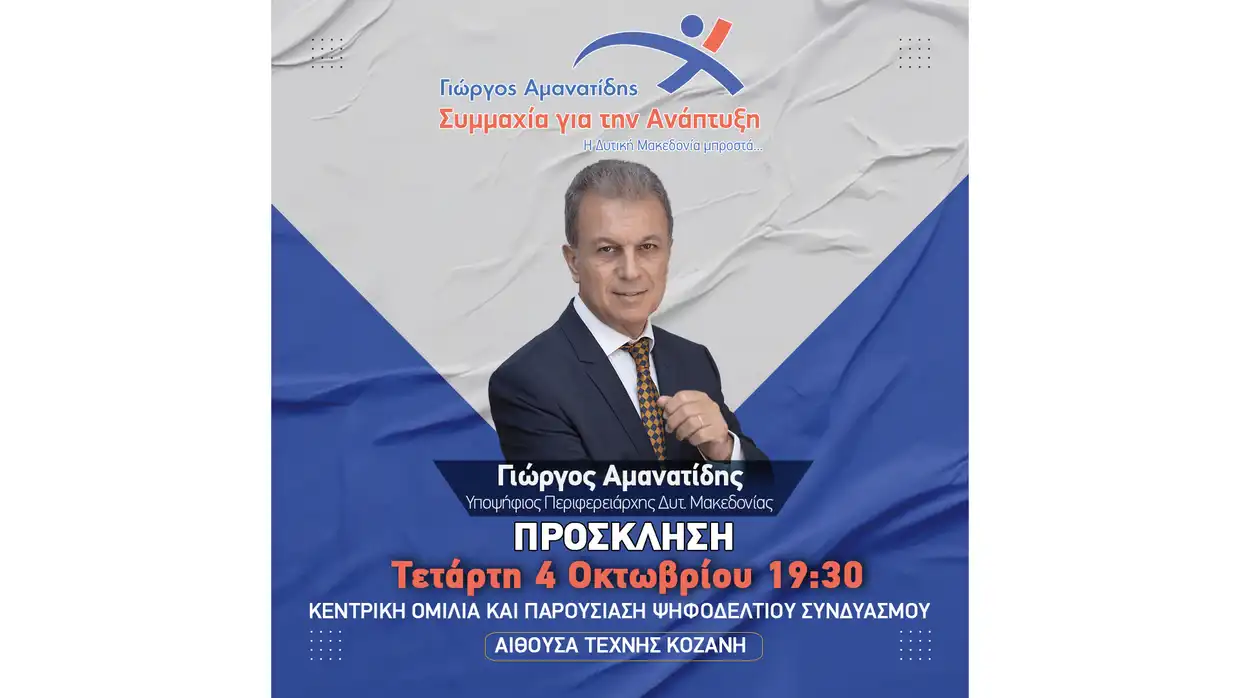 Σας προσκαλούμε αύριο Τετάρτη 4 Οκτωβρίου, στην ομιλία του υποψήφιου Περιφερειάρχη Δυτικής Μακεδονίας Γιώργου Αμανατίδη και στην παρουσίαση των υποψηφίων του συνδυασμού «Συμμαχία για την Ανάπτυξη» που θα πραγματοποιηθεί στις 7:30 μ.μ. στην Αίθουσα Τέχνης στην Κοζάνη.