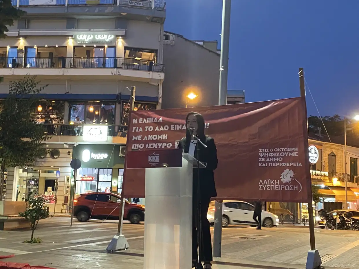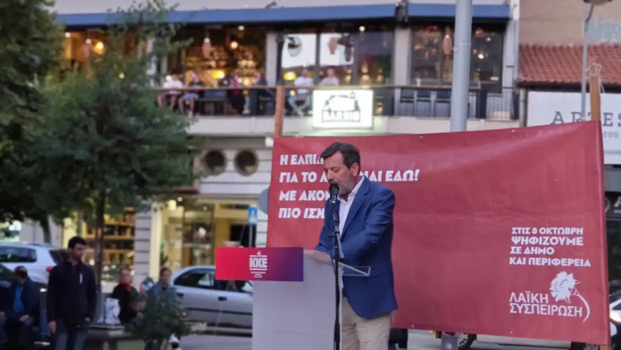 « Για να μην μπορεί να πανηγυρίζει κανένας Μητσοτάκης την άλλη Κυριακή, ότι ο χάρτης βάφτηκε μπλε.  Θέλουμε και επιδιώκουμε να του κοπεί το γέλιο. Με τα ποσοστά της «Λαϊκής Συσπείρωσης» παντού και δω στη Κοζάνη, στην Περιφέρεια της Δυτικής Μακεδονίας, να είναι πάρα πολύ ψηλά!