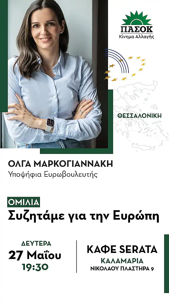 Η Όλγα Μαρκογιαννάκη Διδάκτωρ Πολιτικός Μηχανικός και υποψήφια ευρωβουλευτής με το ΠΑ.ΣΟ.Κ. Κίνημα Αλλαγής , καλεί φίλους και πολίτες της Θεσσαλονίκης σε πολιτική εκδήλωση σήμερα 27 Μαίου και ώρα 19:30 στο καφε Serata (Νικολάου Πλαστήρα 9) στην Καλαμαριά.