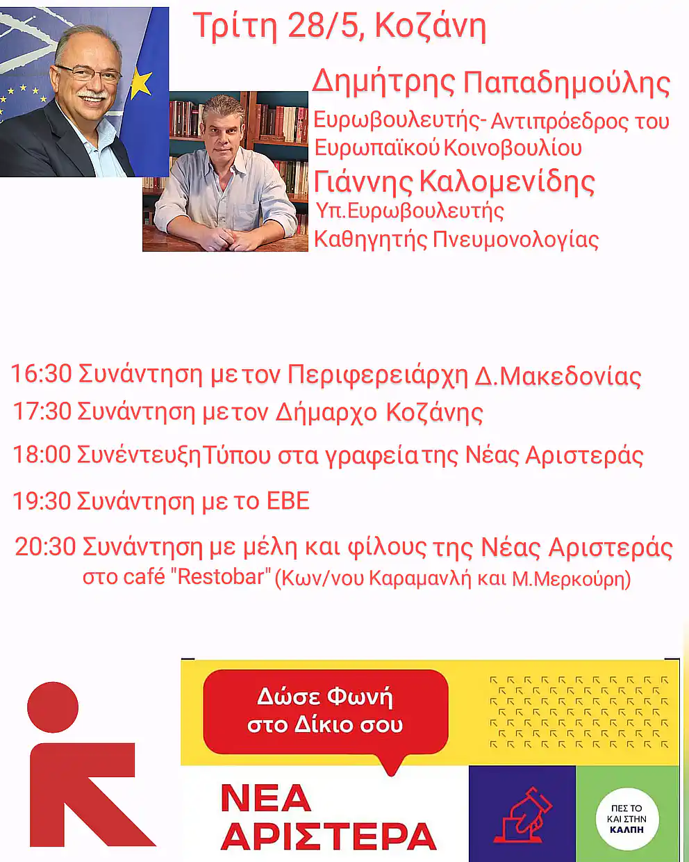 Ο Ευρωβουλευτής και Αντιπρόεδρος του Ευρωπαϊκού Κοινοβουλίου Δημήτρης Παπαδημούλης και ο Υποψήφιος Ευρωβουλευτής Γιάννης Καλομενίδης (καθηγητής Πνευμονολογίας) θα επισκεφθούν την Κοζάνη , την Τρίτη 28/5 ,στο πλαίσιο της προεκλογικής εκστρατείας της Νέας Αριστεράς «Δώσε φωνή στο δίκιο σου!».