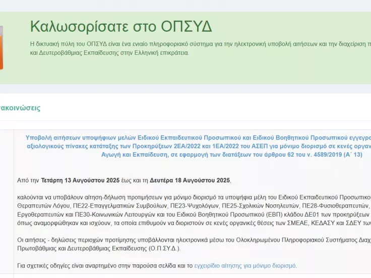 Άνοιξε μόλις τώρα το Ολοκληρωμένο Πληροφοριακό Σύστημα Διαχείρισης Προσωπικού Πρωτοβάθμιας και Δευτεροβάθμιας Εκπαίδευσης (ΟΠΣΥΔ) για τις αιτήσεις / δηλώσεις περιοχών διορισμού 10.000 εκπαιδευτικών στη δημόσια εκπαίδευση.