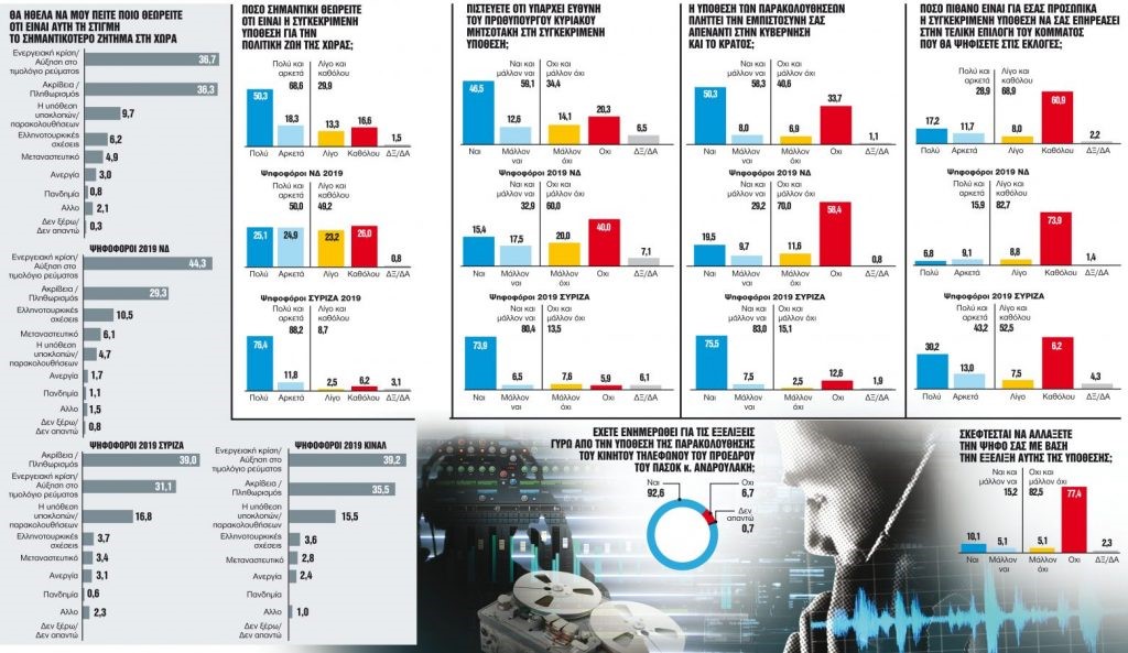 Από την άλλη και εν αντιθέσει με ό,τι θα περίμενε κανείς ενδεχομένως, η υπόθεση των παρακολουθήσεων ανάγεται από τους ερωτηθέντες πολίτες στο τρίτο (και όχι στο πρώτο ή δεύτερο) σημαντικότερο πρόβλημα της χώρας, πίσω από τις τιμές του ρεύματος και γενικότερα την ακρίβεια, υποσκελίζοντας ωστόσο τα ελληνοτουρκικά, το μεταναστευτικό και την πανδημία. Σε κάθε περίπτωση, πάντως, το 68,6% των ερωτηθέντων θεωρεί το ζήτημα ως ιδιαίτερα σημαντικό για την πολιτική ζωή, ενώ όσοι εμφανίζονται αδιάφοροι περιορίζονται στο 29,9% – παρ’ όλα αυτά δεν είναι το θέμα που θα κρίνει την επόμενη ψήφο τους.