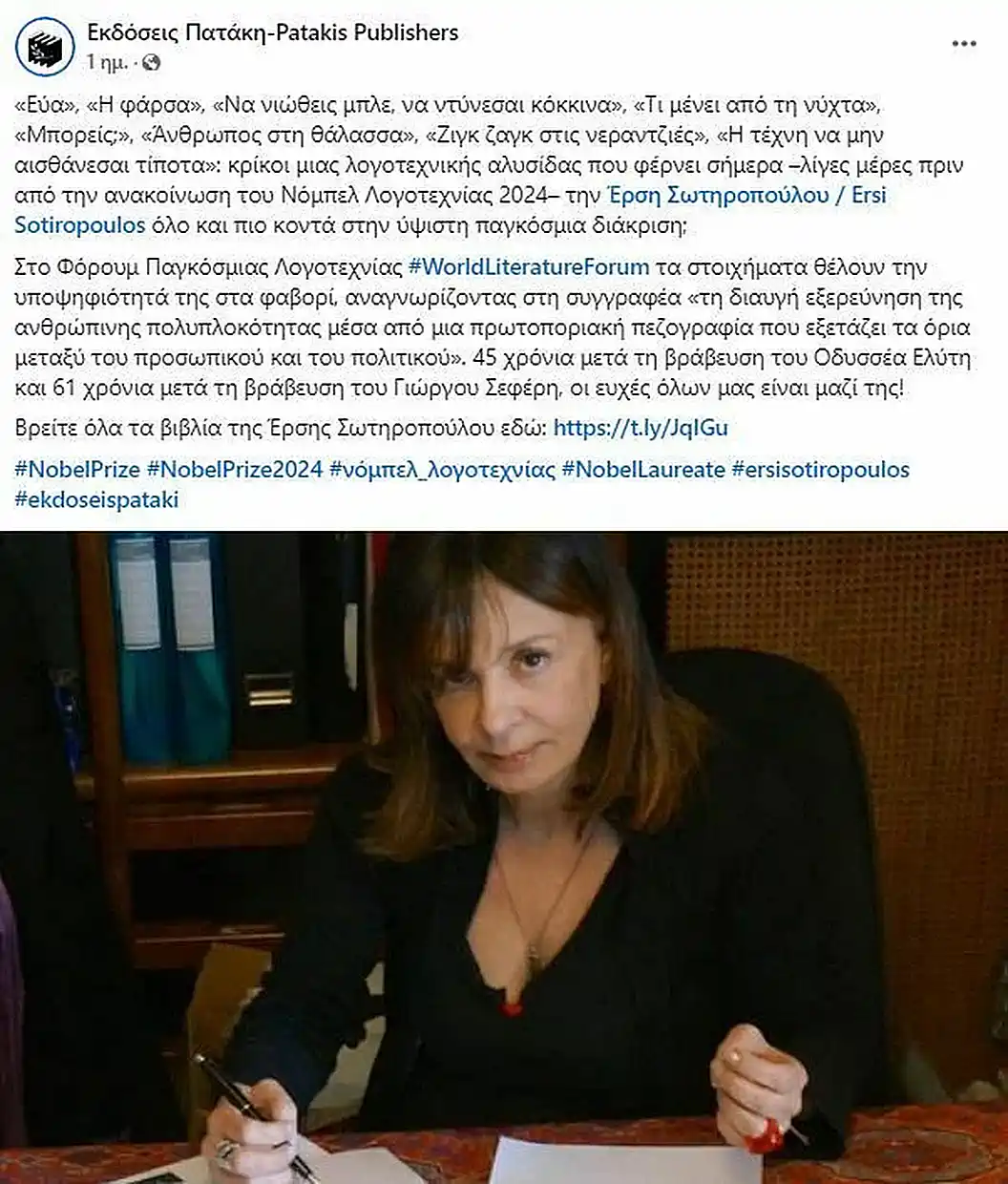 Με ανάρτησή τους, οι εκδόσεις Πατάκη ανακοινώνουν πως η Έρση Σωτηροπούλου είναι μεταξύ των φαβορί για το Νόπλελ Λογοτεχνίας 2024.