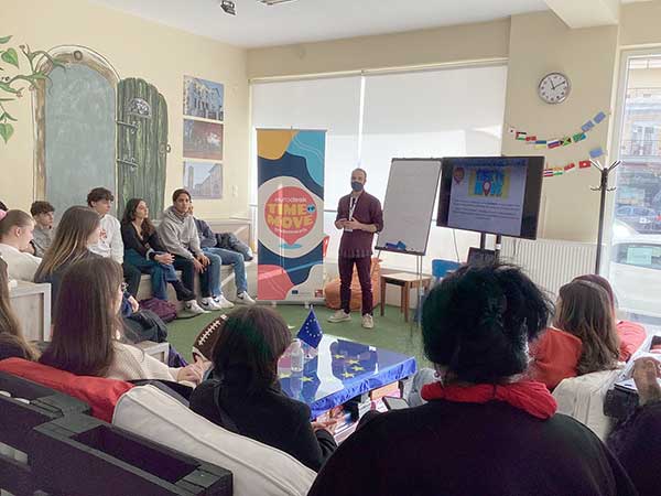 Στη συνέχεια, ο συνεργάτης του ED Δυτικής Μακεδονίας, Άκης Δημητρίου, πληροφόρησε τους μαθητές και εκπαιδευτικούς για την ιστορία της Ευρωπαϊκής Ένωσης, τα θεσμικά της όργανα, τα βήματα Ένταξης της Ελλάδας, της Βουλγαρίας αλλά και για τις χώρες που επιθυμούν να ενταχθούν στην Ευρωπαϊκή Ένωση. Παράλληλα, ενημέρωσε τους συμμετέχοντες για τα προγράμματα νεολαίας που χρηματοδοτούνται από την Ευρωπαϊκή Ένωση και πώς οι νέοι μπορούν να αδράξουν τις ευκαιρίες κινητικότητας για εκπαίδευση, εθελοντισμό και πρακτική άσκηση στο εξωτερικό. Τέλος, οι παρευρισκόμενοι ενημερώθηκαν για τις πολιτικές και τις προτεραιότητες της ΕΕ, αλλά και για την ενημερωτική καμπάνια “Time to Move” του Eurodesk. Αξίζει να σημειωθεί ότι ο Όμιλος Ενεργών Νέων Φλώρινας αποτελεί πολλαπλασιαστή του δικτύου Eurodesk για την Περιφέρεια Δυτικής Μακεδονίας.