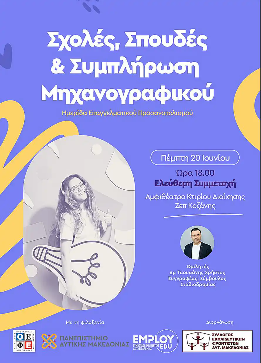Ετοιμαζόμαστε την Πέμπτη 20 Ιουνίου στις 18:00 για μια μοναδική ενημερωτική εκδήλωση που διοργανώνει ο Σύλλογος Φροντιστών Δυτικής Μακεδονίας σε συνεργασία με το Πανεπιστήμιο Δυτικής Μακεδονίας, για να ακούσουμε σημαντικές πληροφορίες για: