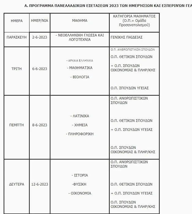 - Τρίτη, 6/6/2023 Αρχαία Ελληνικά, Μαθηματικά, Βιολογία Ο.Π. Ανθρωπιστικών Σπουδών, Ο.Π. Θετικών Σπουδών και Ο.Π. Σπουδών Οικονομίας και Πληροφορικής, Ο.Π. Σπουδών Υγείας