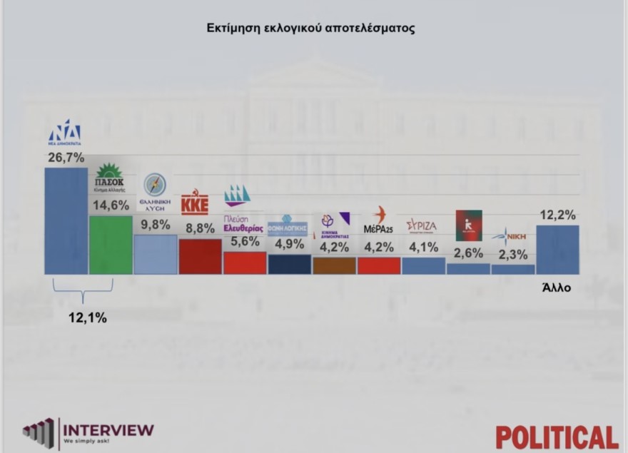 Δημοσκόπηση Interview: 12,1% μπροστά η ΝΔ από το ΠΑΣΟΚ
