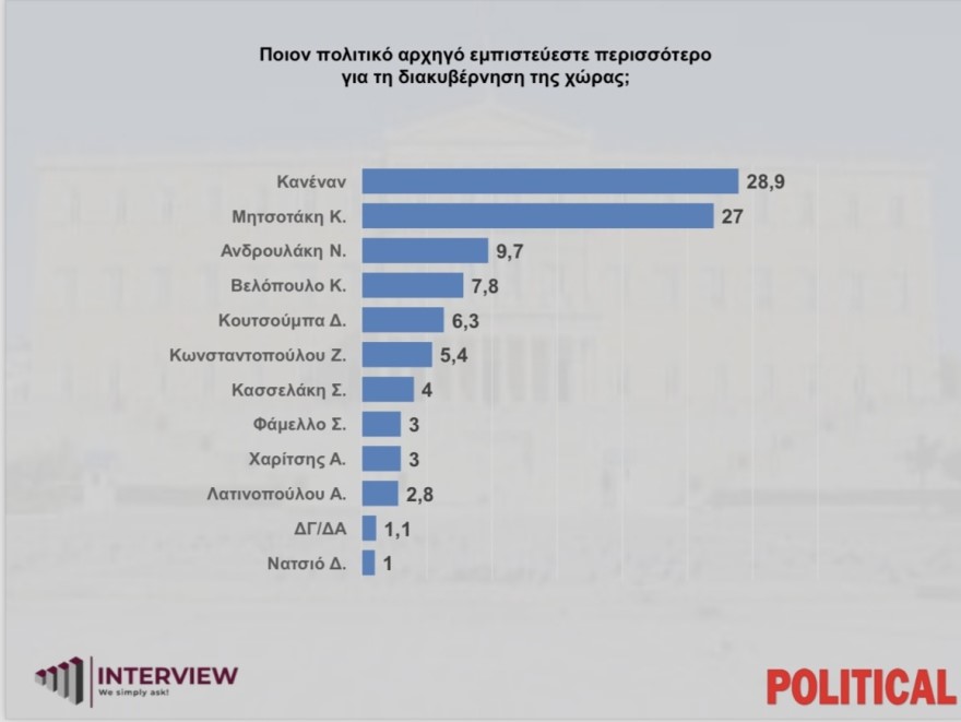 Ο πρωθυπουργός Κυριάκος Μητσοτάκης συνεχίζει παράλληλα να απολαμβάνει της εμπιστοσύνης των πολιτών καθώς συγκεντρώνει το 27% στο ερώτημα «ποιον πολιτικό αρχηγό εμπιστεύεστε περισσότερο για τη διακυβέρνηση της χώρας;» με τον δεύτερο Νίκο Ανδρουλάκη να ακολουθεί από μεγάλη απόσταση.