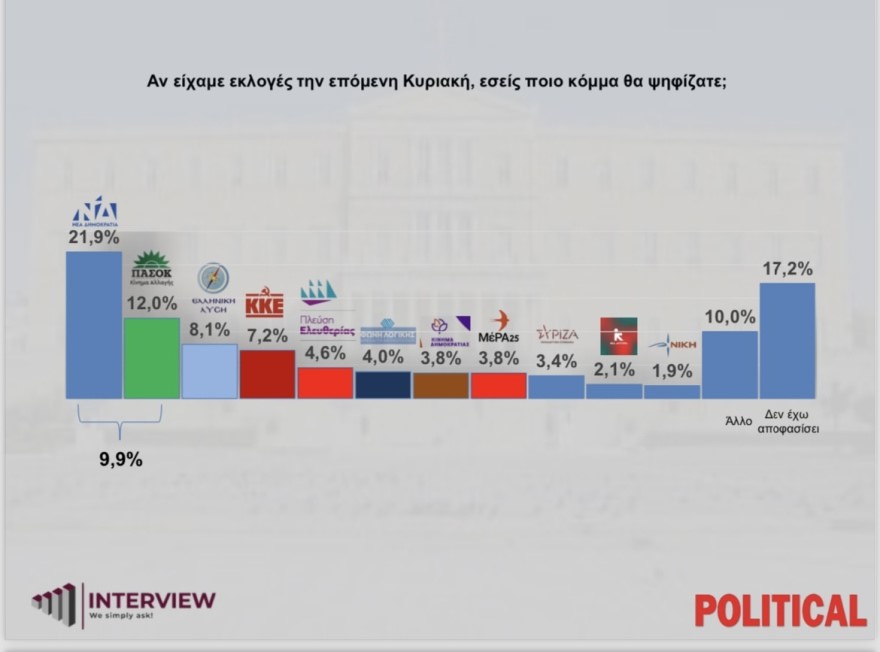 Στο ερώτημα «αν είχαμε εκλογές την επόμενη Κυριακή ποιο κόμμα θα ψηφίζατε;», η ίδια δημοσκόπηση  καταγράφει: 21,9% Νέα Δημοκρατία, 12% ΠΑΣΟΚ, 8,1% Ελληνική Λύση, 7,2% ΚΚΕ, 4,6% Πλεύση Ελευθερίας, 4% Φωνή Λογικής, 3,8% Κίνημα Δημοκρατίας, 3,8% ΜέΡΑ25, 3,4% ΣΥΡΙΖΑ, 2,1% Νέα Αριστερά, 1,9% Νίκη, 10% άλλο και 17,2% δεν έχει αποφασίσει.