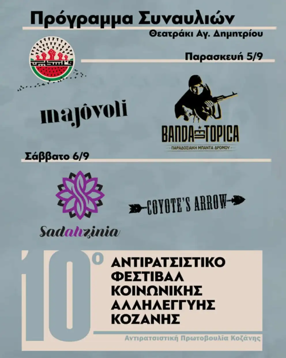 Η μουσική στήνει τη δική της γιορτή στο 10ο Αντιρατσιστικό Φεστιβάλ Κοινωνικής Αλληλεγγύης Κοζάνης, την Παρασκευή 05 και το Σάββατο 06 Σεπτεμβρίου, στο ανοιχτό θεατράκι του Αγίου Δημητρίου, με τέσσερις ξεχωριστές μπάντες, αλλά και τοπικούς Djs που ενώνουν ήχους, εμπειρίες και μηνύματα αλληλεγγύης. Από την αθηναϊκή ροκ σκηνή μέχρι τα βαλκανικά παραδοσιακά μονοπάτια και από την indie ενέργεια ως την πρωτοπόρο φωνή του ελληνικού hip hop, το πρόγραμμα της φετινού φεστιβάλ υπόσχεται δυνατές συναυλιακές στιγμές.