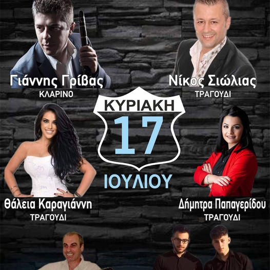 Σας περιμένουμε όλους για μια φανταστική βραδιά με το Γιάννη Γρίβα και Νίκο Σιώλια στο δημοτικό πρόγραμμα, τη Θάλεια Καραγιάννη και τον δικό μας Κυριάκο Αναστασιάδη στο λαϊκό πρόγραμμα και τη Δήμητρα Παπαγερίδου με τους επίσης δικούς μας Γιάννη & Χαράλαμπο Αποστολίδη στο ποντιακό πρόγραμμα!