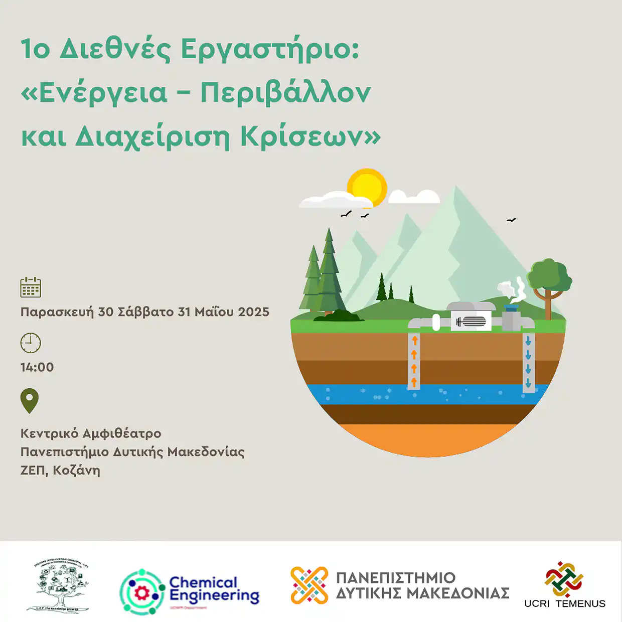 Την Παρασκευή 30 και το Σάββατο 31 Μαΐου 2025, το Πανεπιστήμιο Δυτικής Μακεδονίας διοργανώνει το 1ο Διεθνές Εργαστήριο με τίτλο: «Ενέργεια – Περιβάλλον και Διαχείριση Κρίσεων», στο Κεντρικό Αμφιθέατρο της Πανεπιστημιούπολης στη ΖΕΠ Κοζάνης.