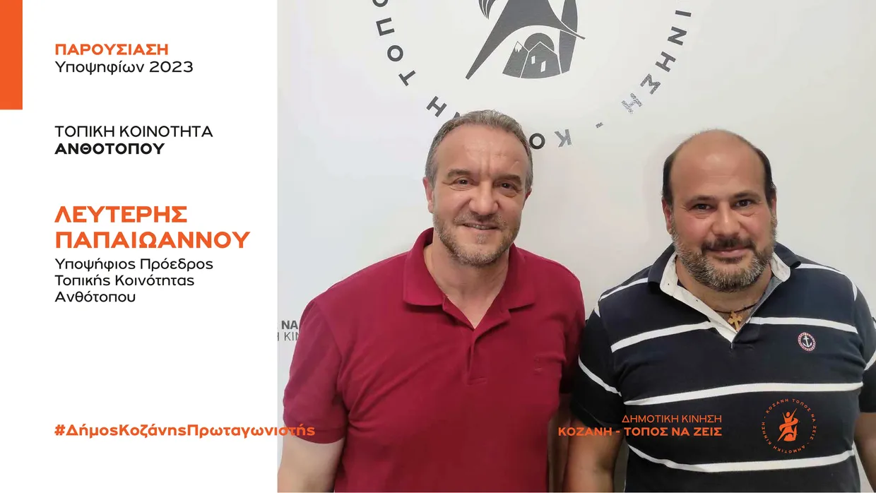 Η Δημοτική Κίνηση «Κοζάνη Τόπος να Ζεις» καλωσορίζει με χαρά ως υποψήφιο Πρόεδρο για την τοπική Κοινότητα Ανθοτόπου τον Λευτέρη Παπαϊωάννου.