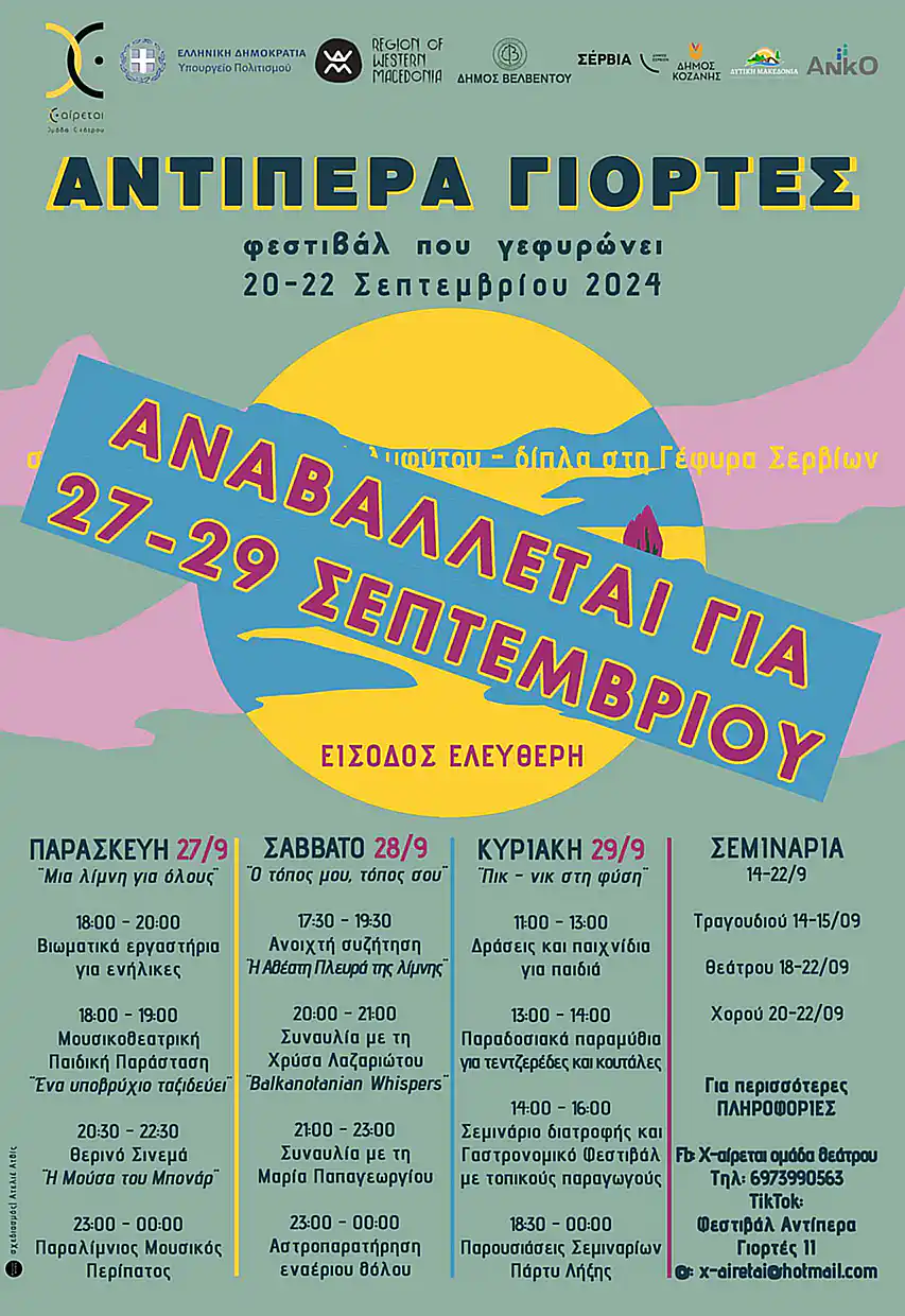 Λόγω καιρικών συνθηκών το πρόγραμμα των δράσεων του Πολυθεματικού Φεστιβάλ Αντίπερα Γιορτές αναβάλλεται.