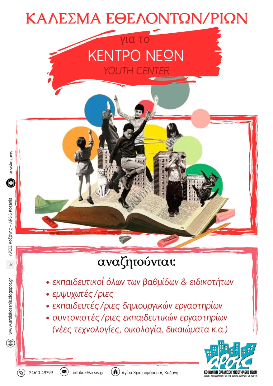 Το Κέντρο Νέων της ΑΡΣΙΣ Κοζάνης ετοιμάζεται να συστηθεί στην πόλη μας και ανοίγει τις πόρτες του αναζητώντας ανθρώπους που θέλουν να μοιραστούν τη γνώση, τη φαντασία και το μεράκι τους με τα παιδιά της πόλης. Αν είσαι εκπαιδευτικός, εικαστικός ή απλώς ένας δημιουργικός άνθρωπος που θα ήθελε να υλοποιήσει ένα δικό του project, μπορείς να επικοινωνήσεις μαζί μας και να γίνεις μέρος της ομάδας του Κέντρου Νέων.