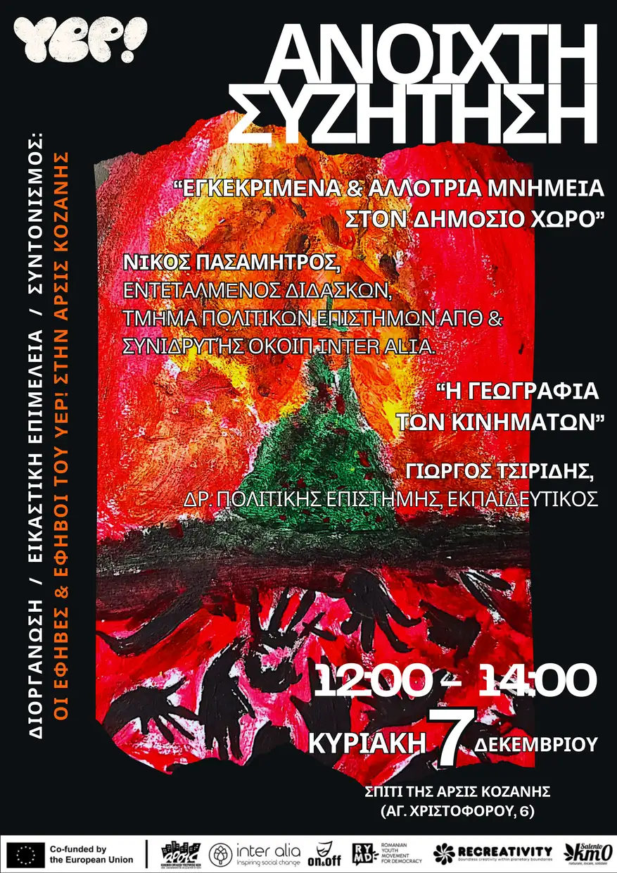 Οι έφηβες και οι έφηβοι της ομάδας του YEP! της ΑΡΣΙΣ Κοζάνης σας προσκαλούν στην πρώτη ανοιχτή συζήτηση με τίτλο: «Ποια μνήμη εγγράφεται στον δημόσιο χώρο», την Κυριακή 7 Δεκεμβρίου, στις 12:00, στο σπίτι της ΑΡΣΙΣ Κοζάνης (Αγ. Χριστοφόρου 6).