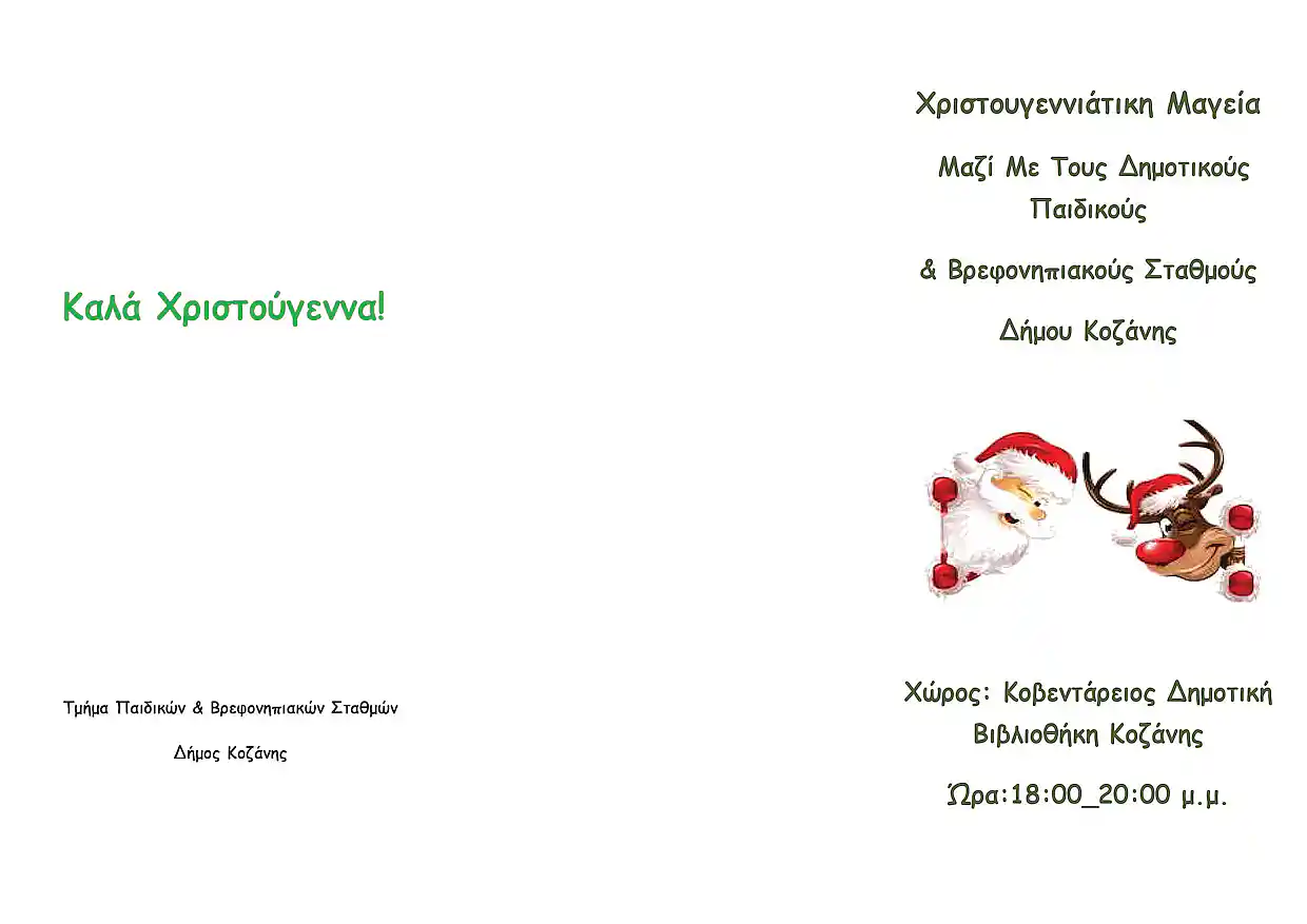 Το Τμήμα Παιδικών και Βρεφονηπιακών Σταθμών της Διεύθυνσης Κοινωνικής Προστασίας Παιδείας και Πολιτισμού του Δήμου Κοζάνης συμμετέχει στις Χριστουγεννιάτικες Δράσεις του Δήμου στο χώρο της Κοβενταρείου Δημοτικής Βιβλιοθήκης :
