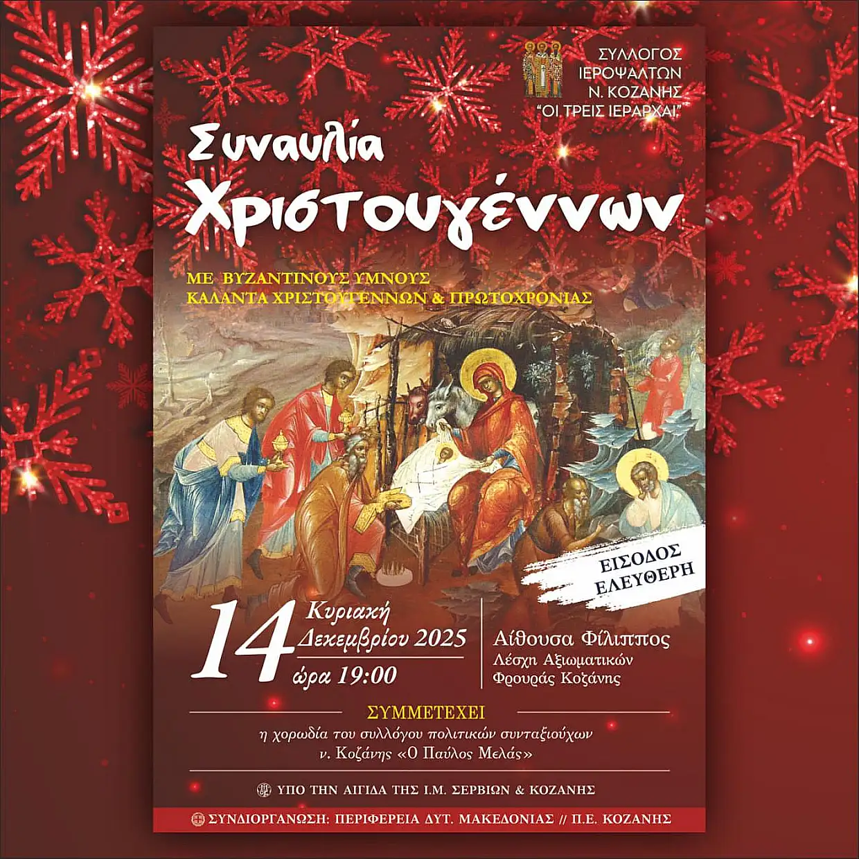 O Σύλλογος Ιεροψαλτών Ν. Κοζάνης «ΟΙ ΤΡΕΙΣ ΙΕΡΑΡΧΑΙ», διοργανώνει στις  14 Δεκεμβρίου 2025  και ώρα  19.00, στην αίθουσα  ΦΙΛΙΠΠΟΣ (Λέσχη Αξιωματικών Φρουράς Κοζάνης), την καθιερωμένη χριστουγεννιάτικη συναυλία με βυζαντινούς ύμνους και κάλαντα Χριστουγέννων και Πρωτοχρονιάς, προσφέροντας μια κατανυκτική   και εορταστική εμπειρία.