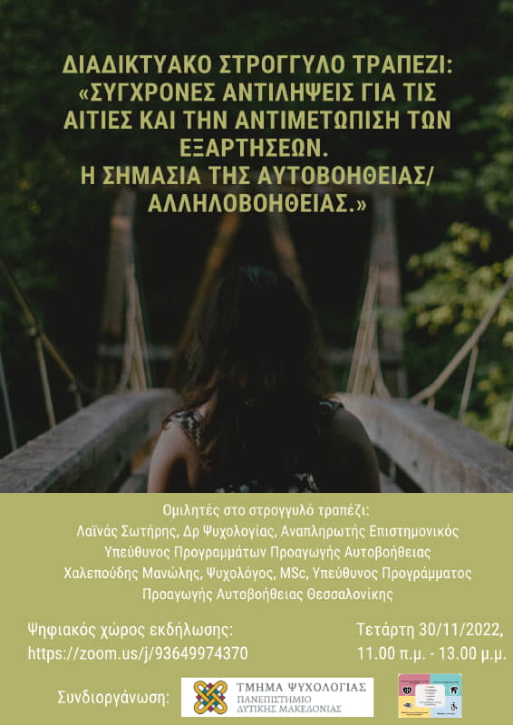 Το Τμήμα Ψυχολογίας της Σχολής Κοινωνικών και Ανθρωπιστικών Επιστημών και η Μονάδα Υποστήριξης Φοιτητών Ευπαθών Ομάδων του Πανεπιστημίου Δυτικής Μακεδονίας συνδιοργανώνουν στο πλαίσιο της συνεργασίας τους την Τετάρτη 30 Νοεμβρίου 2022 και ώρα 11:00, διαδικτυακό στρογγυλό τραπέζι, με τίτλο : «Σύγχρονες αντιλήψεις για τις αιτίες και την αντιμετώπιση των εξαρτήσεων. Η σημασία της αυτοβοήθειας/αλληλοβοήθειας».