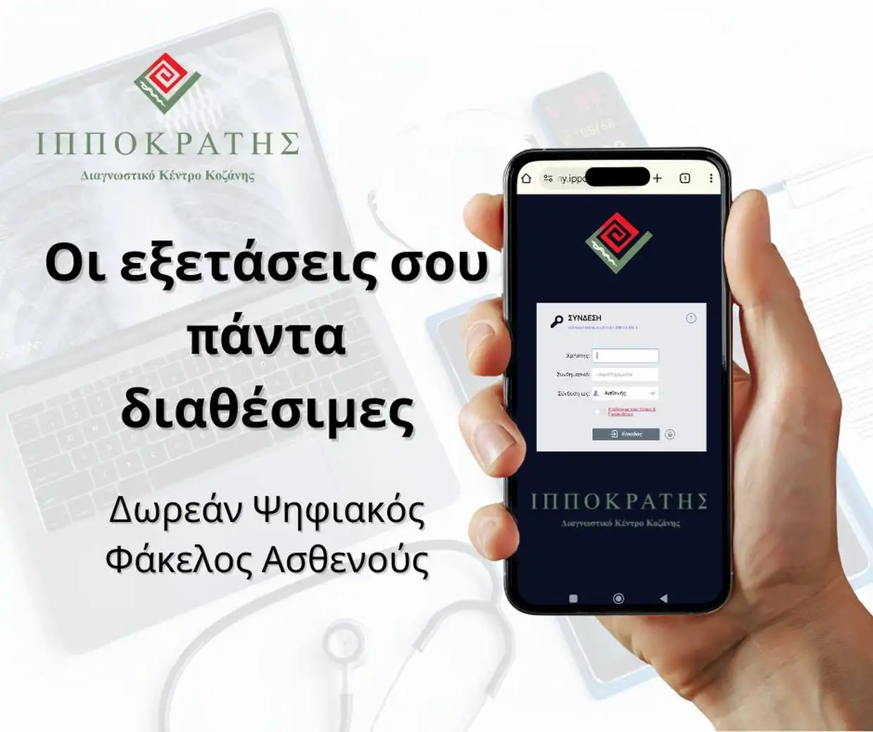 Το Διαγνωστικό Κέντρο «Ιπποκράτης» Κοζάνης, σε διαρκή αναζήτηση καινοτόμων λύσεων για την καλύτερη εξυπηρέτηση των ανθρώπων που τον εμπιστεύονται, παρουσιάζει τον Ψηφιακό Φάκελο Ασθενών, μία νέα υπηρεσία που φέρνει την ιατρική πληροφορία πιο κοντά στον πολίτη.