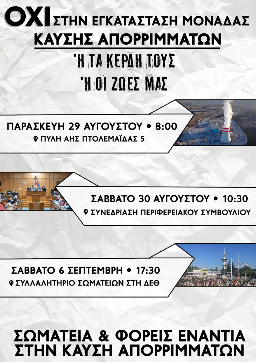 - Την Παρασκευή 29 Αυγούστου συγκέντρωση στην πύλη του ΑΗΣ «Πτολεμαΐδα 5», στο χώρο που προβλέπεται να κατασκευαστεί η μονάδα καύσης.