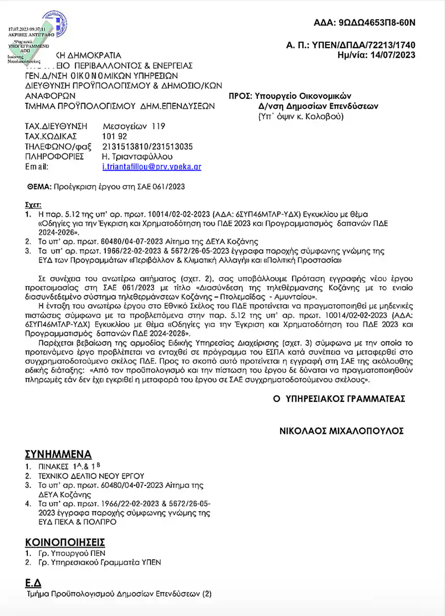 - Εάν αναζητούσαν το από 10/7/2023 έγγραφο του Υπουργείου Περιβάλλοντος το οποίο ρητά διαβεβαιώνει ότι «Παρέχεται βεβαίωση της αρμόδιας Ειδικής Υπηρεσίας Διαχείρισης σύμφωνα με την οποία το προτεινόμενο έργο προβλέπεται να ενταχθεί σε πρόγραμμα του ΕΣΠΑ …»
