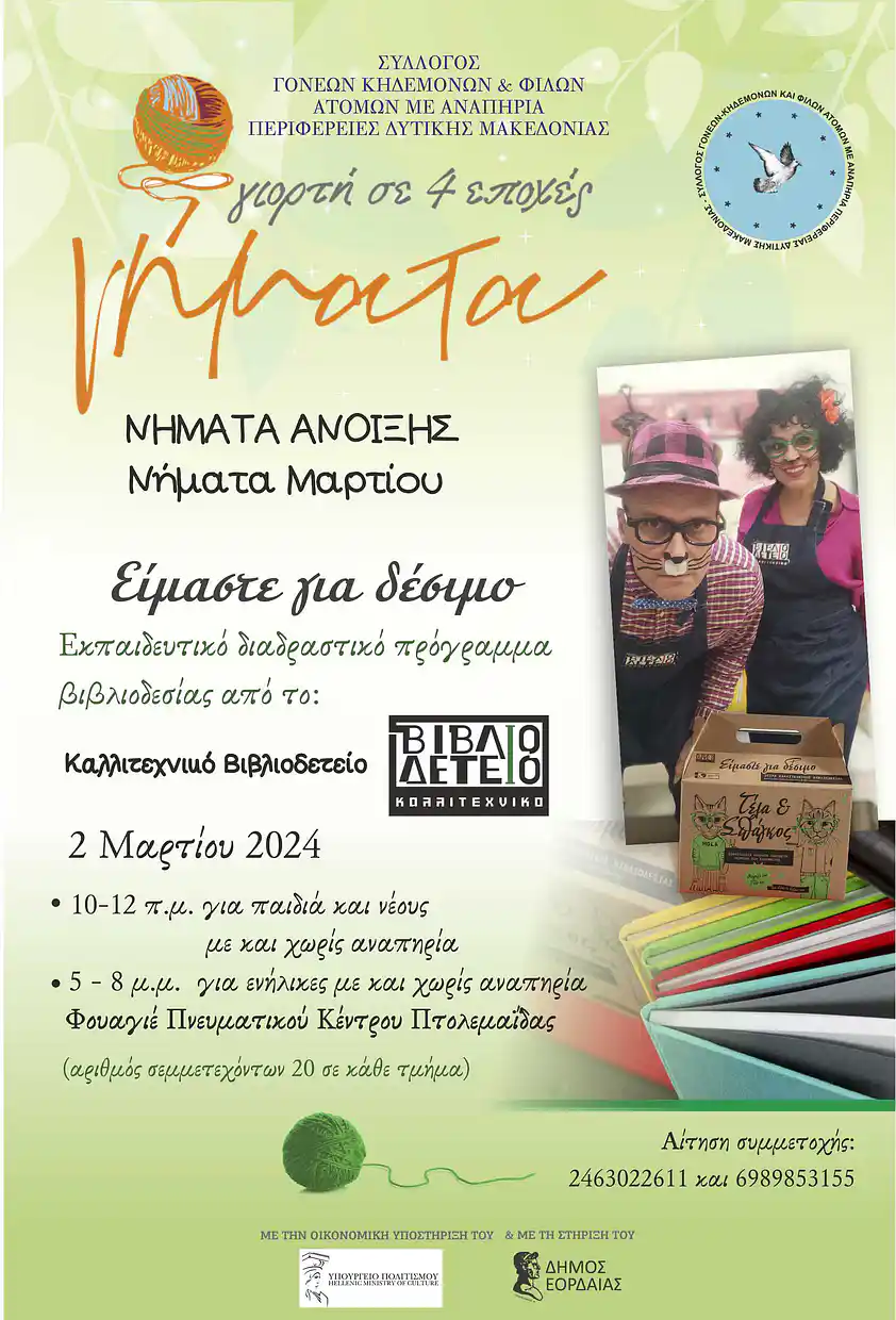 Εκπαιδευτικό διαδραστικό πρόγραμμα βιβλιοδεσίας για παιδιά και νέους (με και χωρίς αναπηρία) από το «ΚΑΛΛΙΤΕΧΝΙΚΟ ΒΙΒΛΙΟΔΕΤΕΙΟ», δηλαδή την Ειρήνη Λειβαδιώτη, τη Ράνια Καμπουράκη και τον Νίκο Λειβαδιώτη.