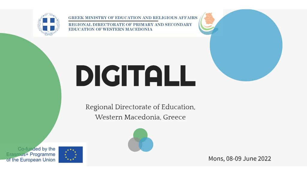 Την Τετάρτη και Πέμπτη 8 και 9 Ιουνίου 2022 πραγματοποιήθηκε η τρίτη (υβριδική) εταιρική συνάντηση (TPM) στο πλαίσιο του προγράμματος Erasmus+ (κωδικός προγράμματος: 2020-1-BE01-KA226-SCH-082731) με τίτλο “DigitALL” στη Μονς στη Γαλλία. Η Περιφερειακή Διεύθυνση Εκπαίδευσης Δυτικής Μακεδονίας. συνεργάζεται με δημόσιους και ιδιωτικούς εκπαιδευτικούς οργανισμούς από την Ιταλία, την Πορτογαλία, τη Ρουμανία και δυο από το Βέλγιο, ο ένας από τους οποίους είναι και ο συντονιστής του προγράμματος. Βασικός σκοπός του προγράμματος είναι να παρέχει καθοδήγηση και υποστήριξη στους εκπαιδευτικούς πρωτοβάθμιας και δευτεροβάθμιας εκπαίδευσης για την προσαρμογή ψηφιακού υλικού στις ανάγκες των μαθητών με ειδικές ανάγκες στο πλαίσιο της συμπεριληπτικής παιδαγωγικής προσέγγισης.
